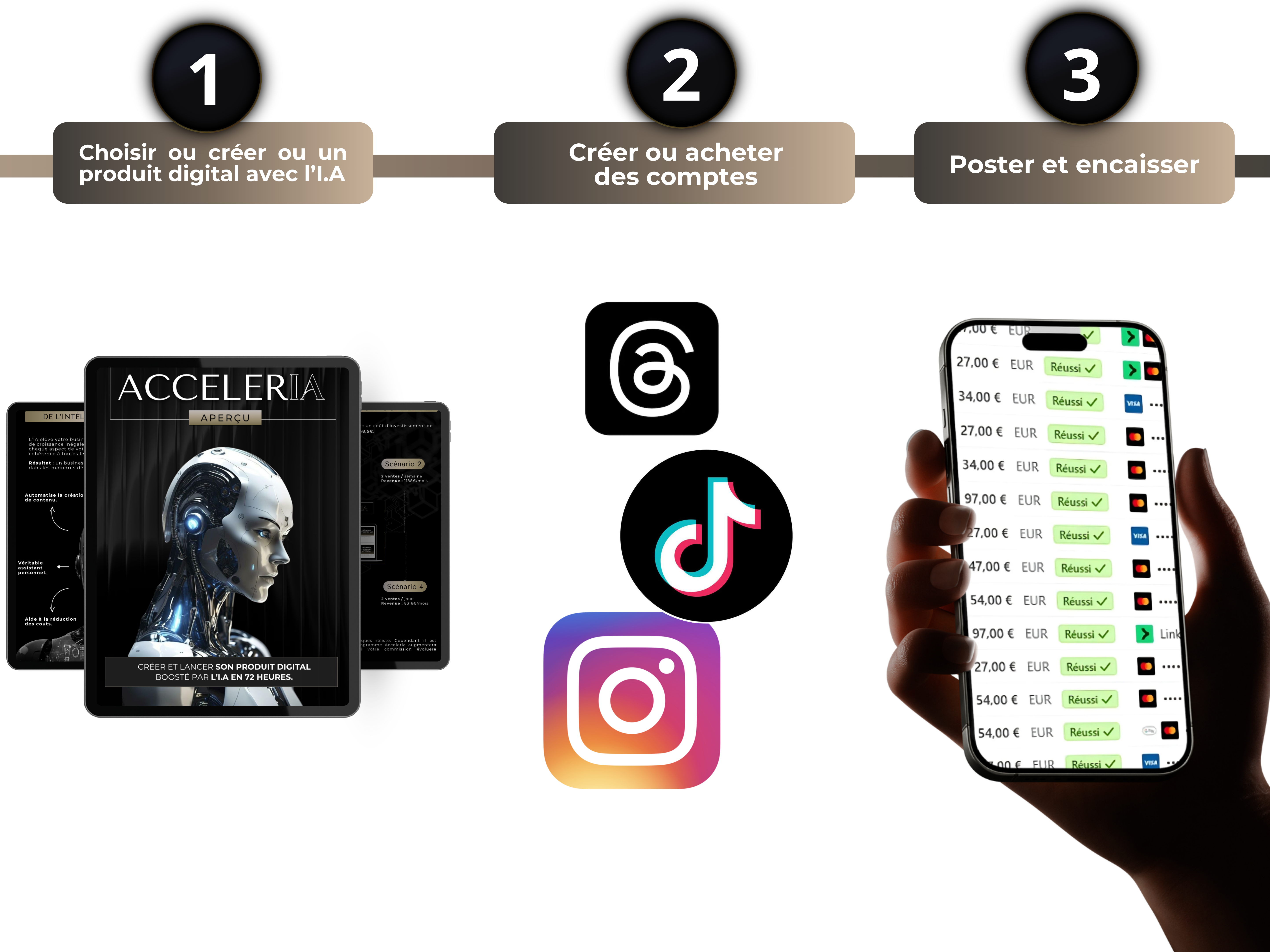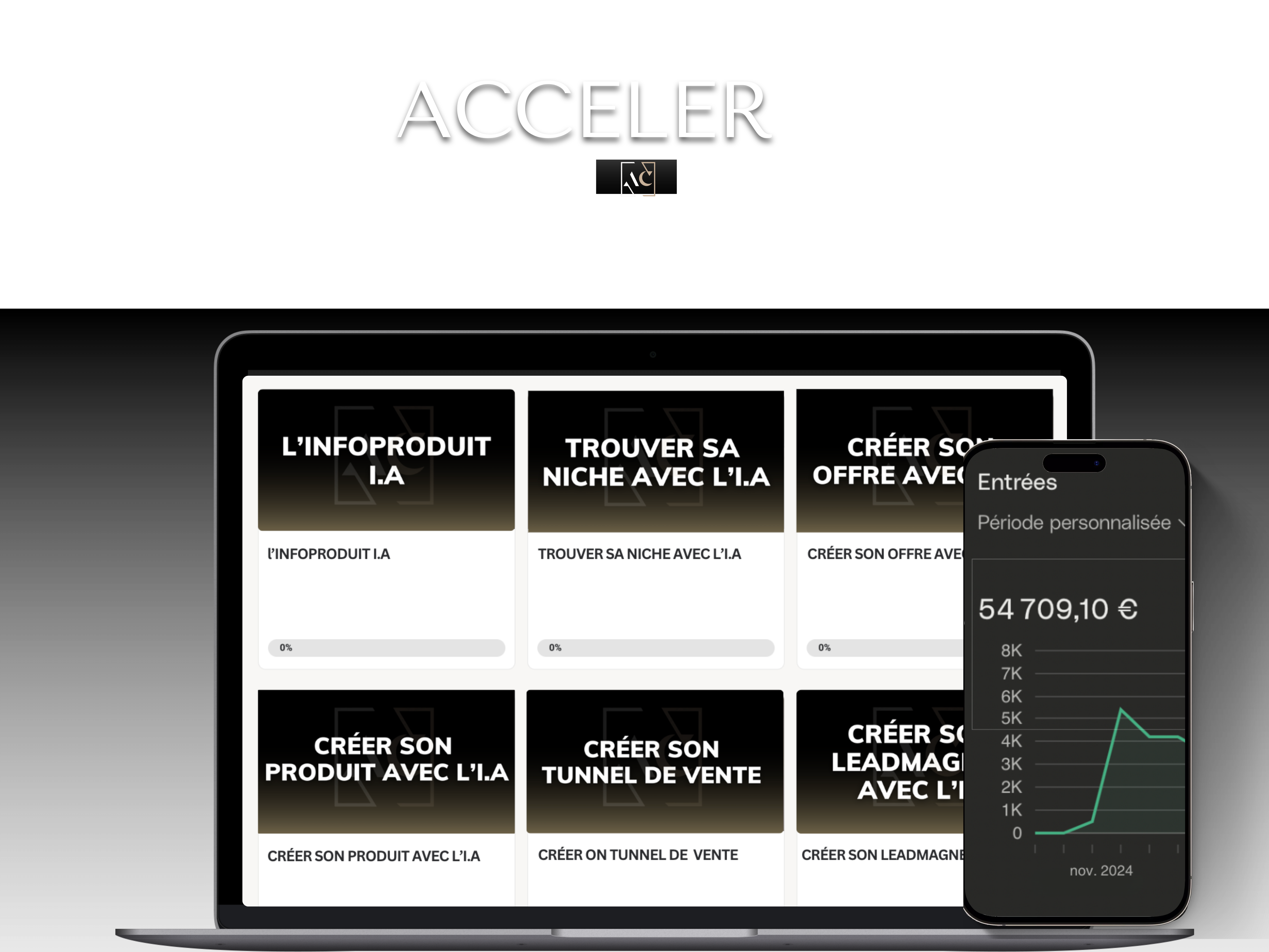 Acceleria est un programme innovant qui t'apprend à générer des revenus passifs grâce à la création d'infoproduit (produits digitaux) et 'intelligence artificielle.